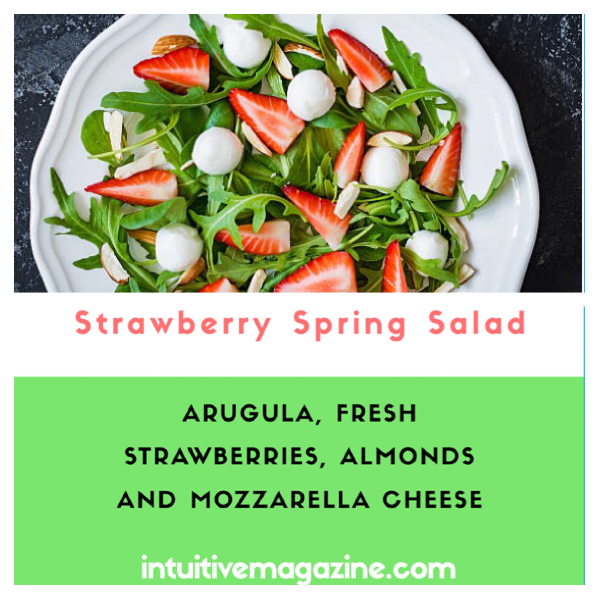 Fresh, in-season strawberries arugula and spinach accompany vegan mozzarella cheese in this refreshing salad.
